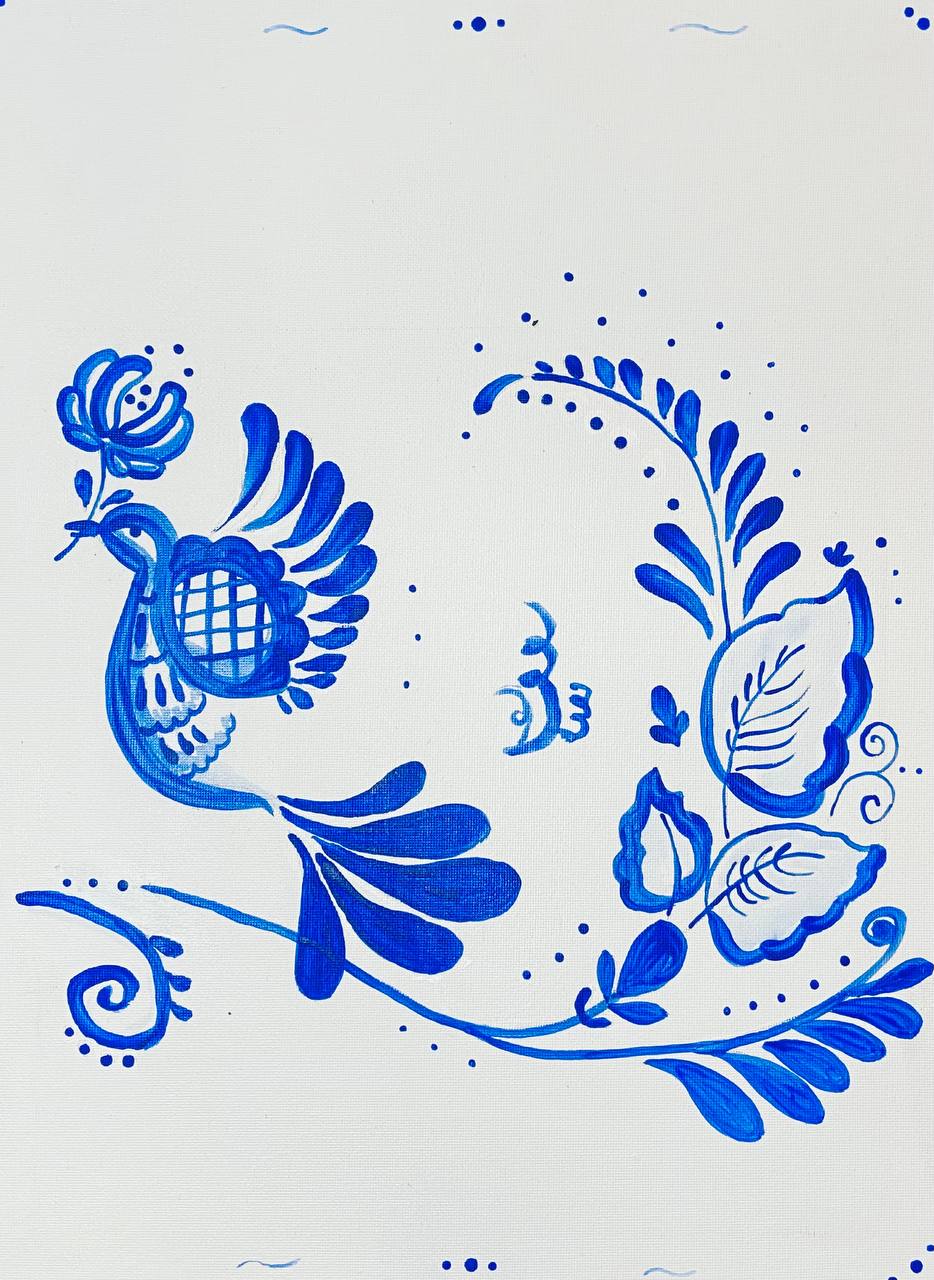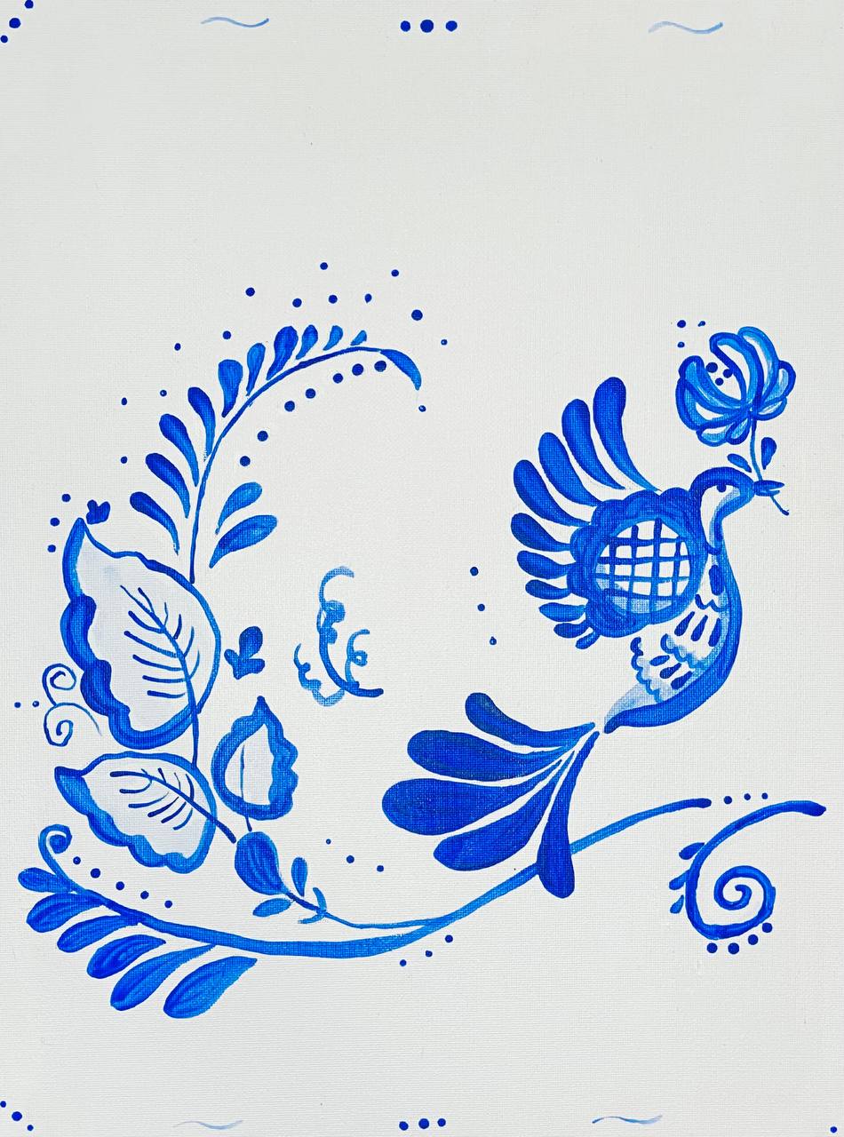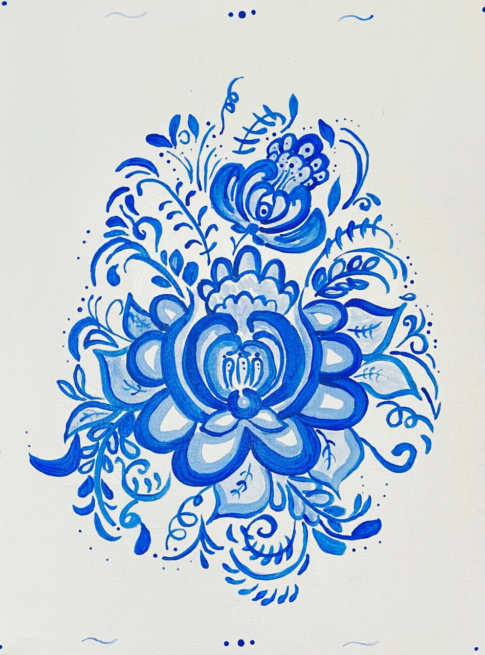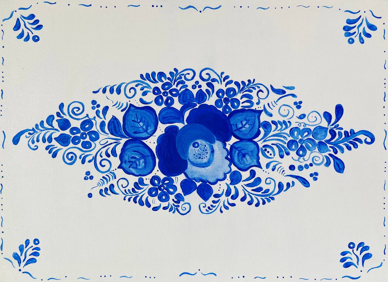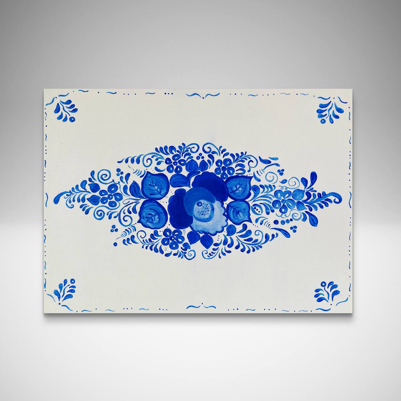 Её листочки расписаны мягкими синими мазками от тёмного к светлому. Дополняют композицию изящные завитки и веточки с листьями, и ягодками. Завершает картину окантовка в виде растительного орнамента и классические синие торцы.