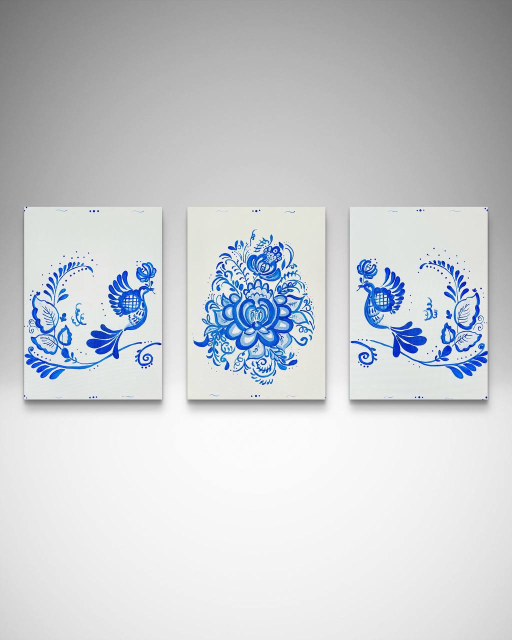 Бело-синие переливы, утончённые узоры и плавные линии триптиха создали атмосферу уюта и благородства, а утончённые узоры и мастерство исполнения превратят любое пространство в галерею русского искусства.