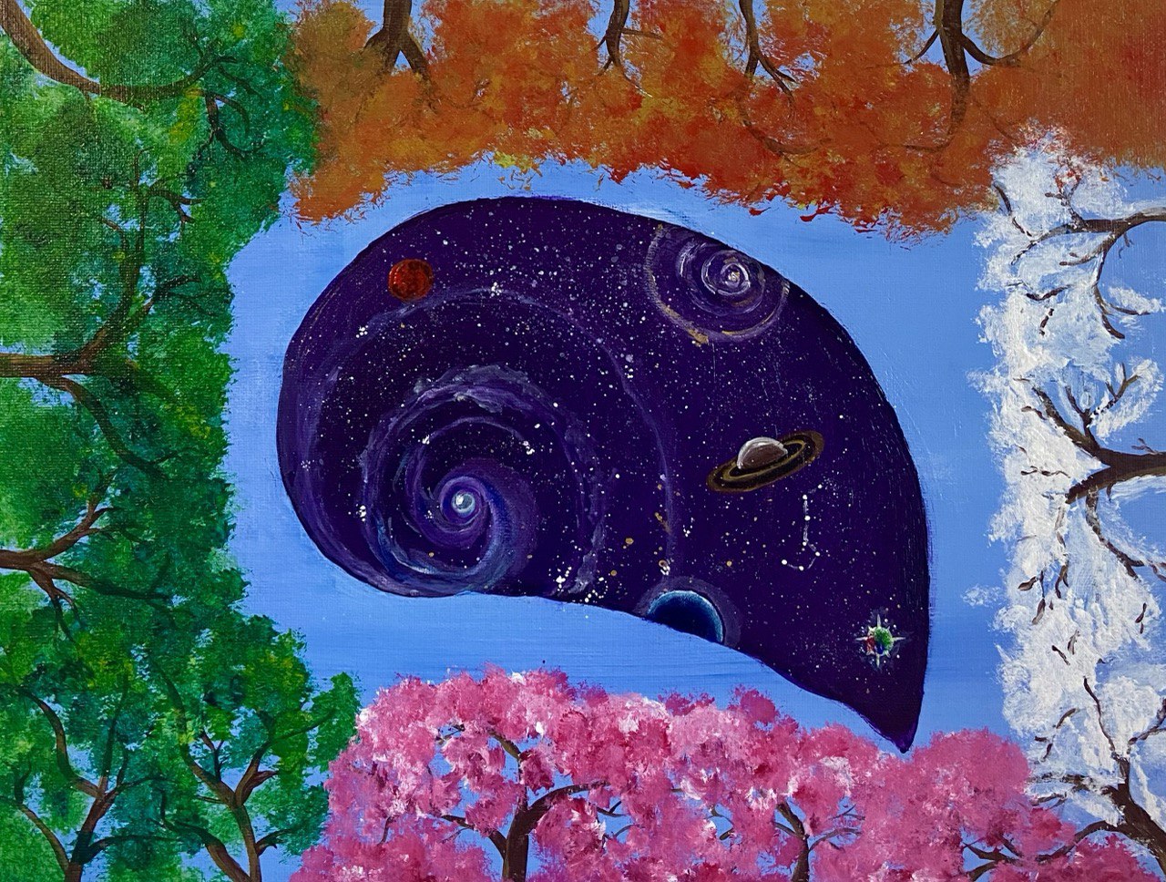 Здесь изображен поток энергии в виде спирали, называющейся «бесконечность»: её символизирует 4 сезона. От лета до зимы поток устремляется вверх в космос и становится бесконечностью.